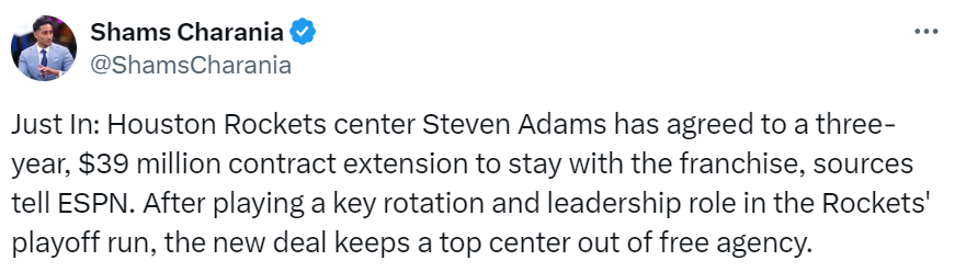 北京时间6月15日,火箭和替补中锋亚当斯续签了3年3900万美元合同,让这位非常实用的蓝领中锋留在休城,也让湖人、勇士等想要挖亚当斯的球队计划落空。亚当斯是火箭的重要内线轮换球员,在今年季后赛的表现非常出色。